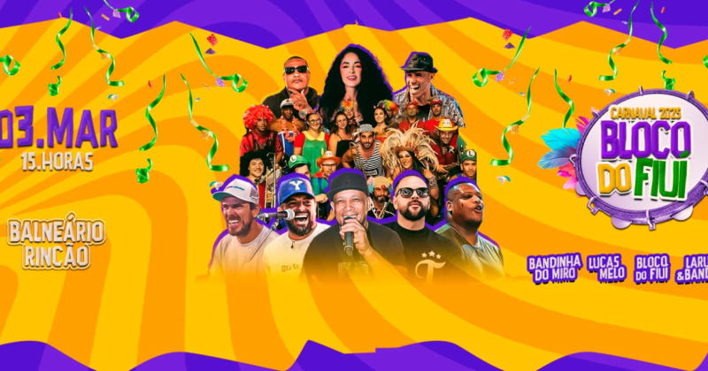 Depois de 8 anos fazendo história em Laguna, o Bloco do Fiui chega ao Rincão pela primeira vez e promete agitar todo mundo! Vem pra essa festa com muita música, cor e alegria, e faça parte desse momento única! Não vai perder, né?