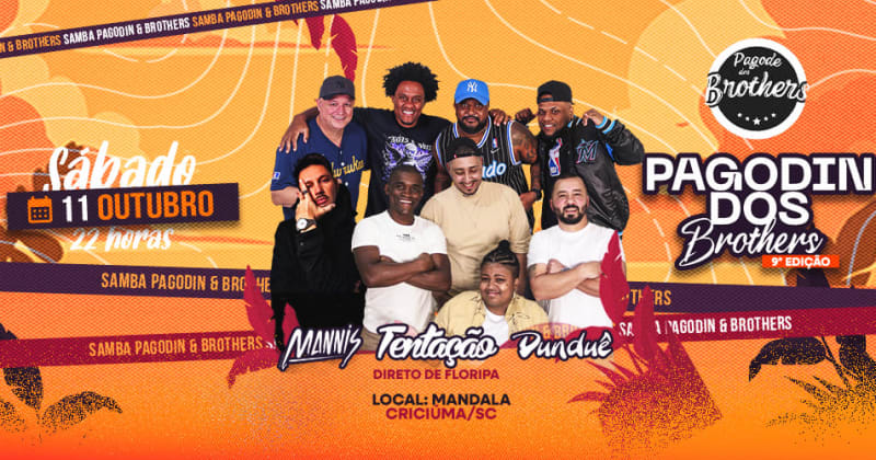 Prepare-se, Criciúma! 🌟 No sábado, 11 de outubro, a partir das 22h, o Mandala será palco de mais uma edição inesquecível do Pagodin dos Brothers.